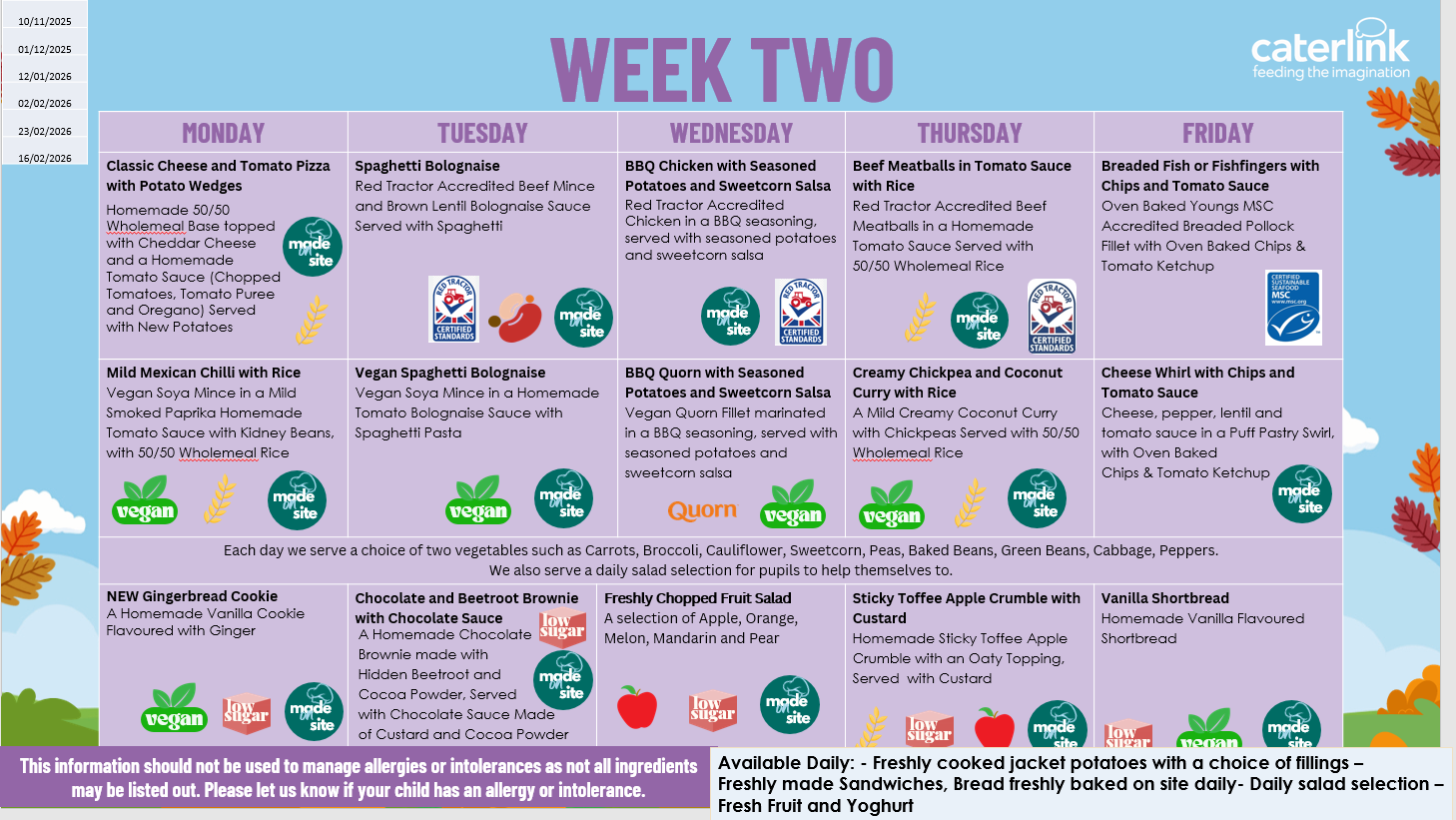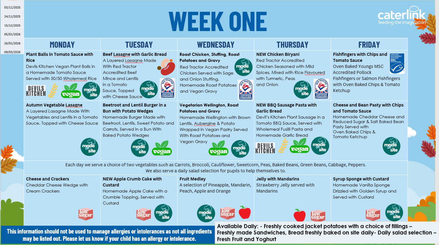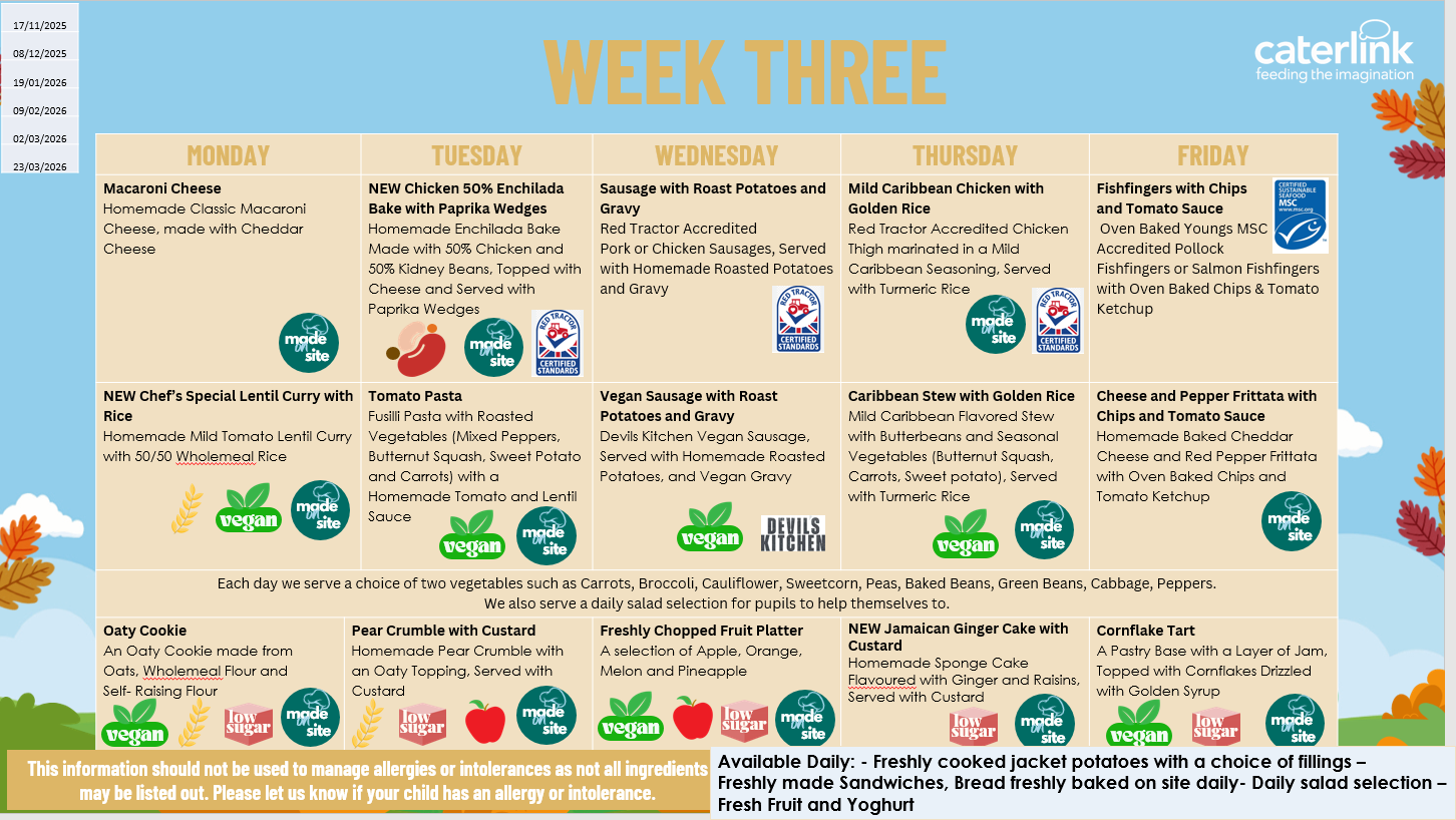 The menus will run on a 3 week rota. A vegetarian option and baked potatoes are available every day for those who prefer a meat free alternative to the main dish. These will need to be pre-ordered by Fridays for the following week and will be subject to availability. Fresh fruit and bread are also available daily.